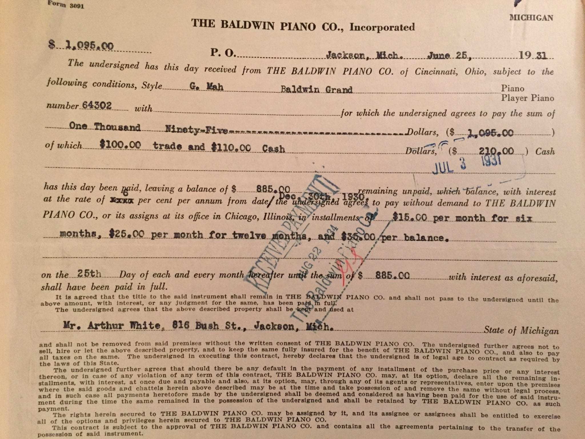 Inside the piano bench, there was a letter from the Baldwin Piano Company along with the original invoice for $1100. (I think I spent that much in gas for the box truck when we went to pick up the piano!)